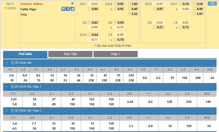 Bảng tỷ lệ kèo trực tuyến trận Ath Bilbao vs Celta Vigo: