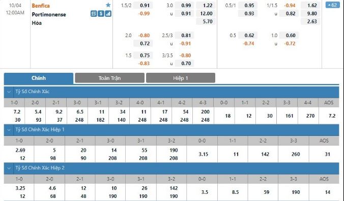 Bảng tỷ lệ kèo trực tuyến trận đấu Benfica vs Portimonense:
