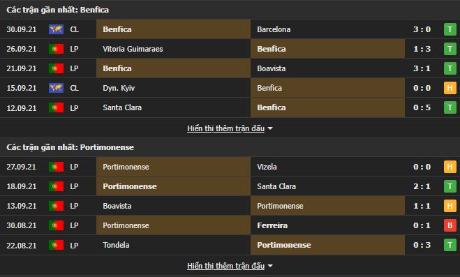 Phong độ gần đây Benfica vs Portimonense: