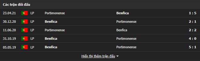 Thành tích đối đầu Benfica vs Portimonense:
