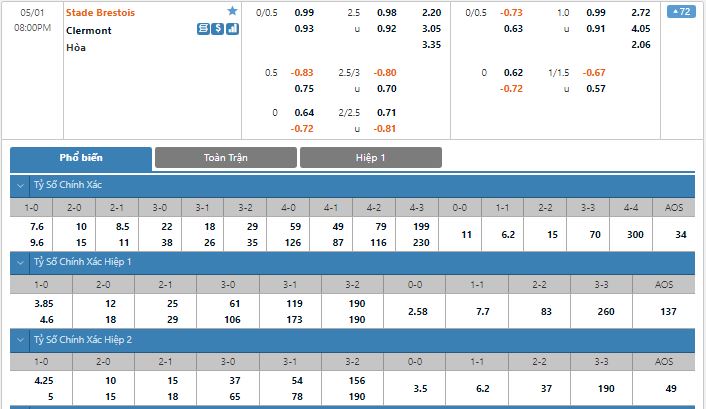 Bảng tỷ lệ kèo trực tuyến trận Brest vs Clermont: