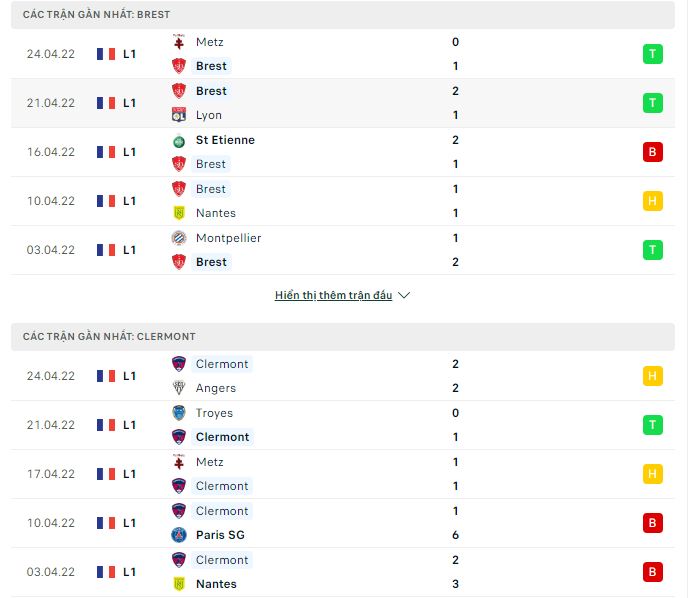 Phong độ gần đây Brest vs Clermont: