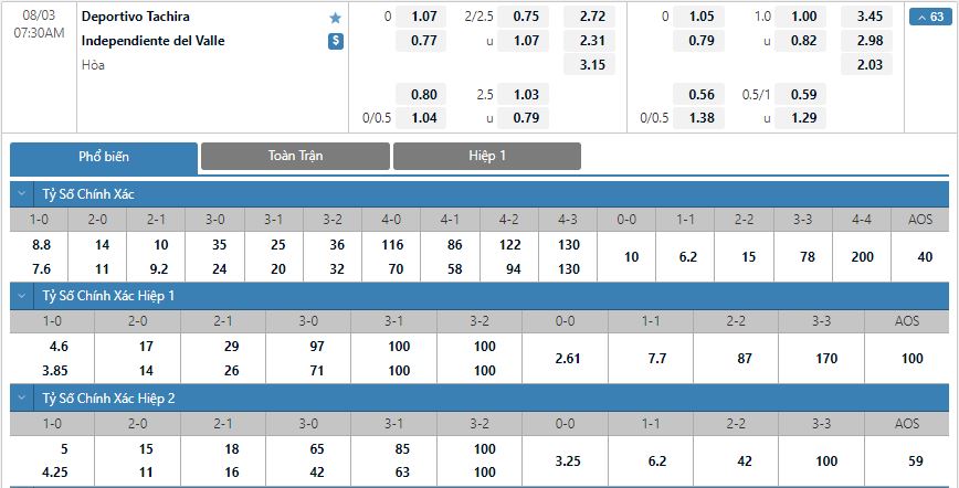 Bảng tỷ lệ kèo trực tuyến trận Deportivo Tachira vs Independiente del Valle