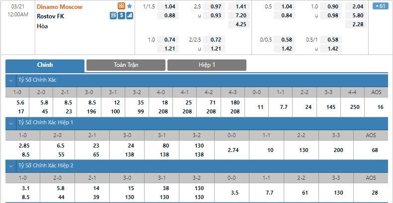 Bảng tỷ lệ kèo bóng đá Dynamo Moscow vs FK Rostov