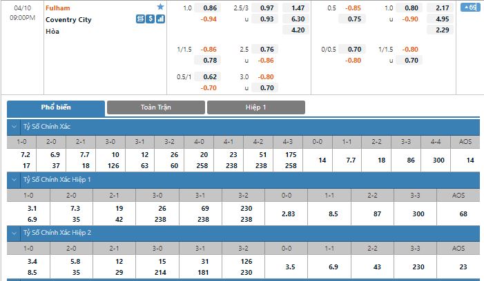 Bảng tỷ lệ kèo trực tuyến trận Fulham vs Coventry: