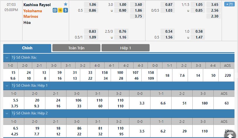 Bảng tỷ lệ kèo bóng đá Kashiwa Reysol vs Yokohama F. Marinos