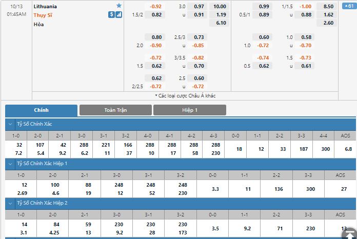 Bảng tỷ lệ kèo trực tuyến trận đấu Lithuania vs Thụy Sĩ: