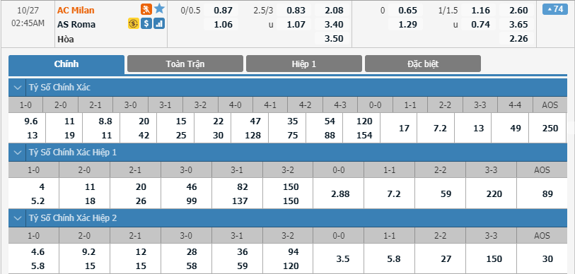 - Tỷ lệ kèo bóng đá AC Milan vs AS Roma