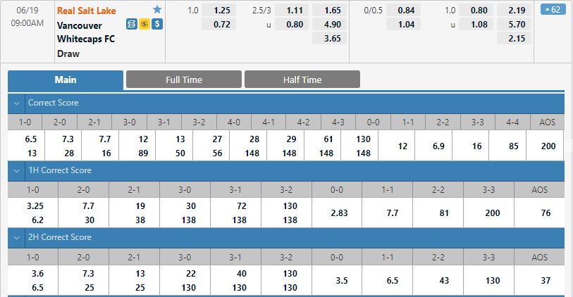 Bảng tỷ lệ kèo bóng đá Real Salt Lake vs Vancouver Whitecaps