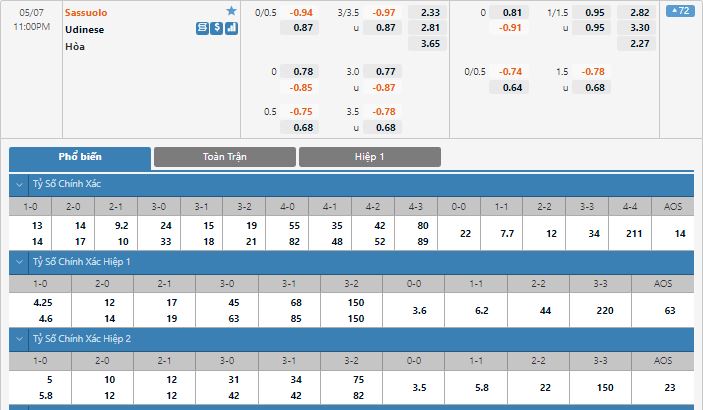 Bảng tỷ lệ kèo trực tuyến trận Sassuolo vs Udinese: