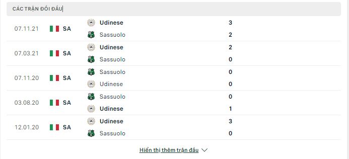 Thành tích đối đầu Sassuolo vs Udinese: