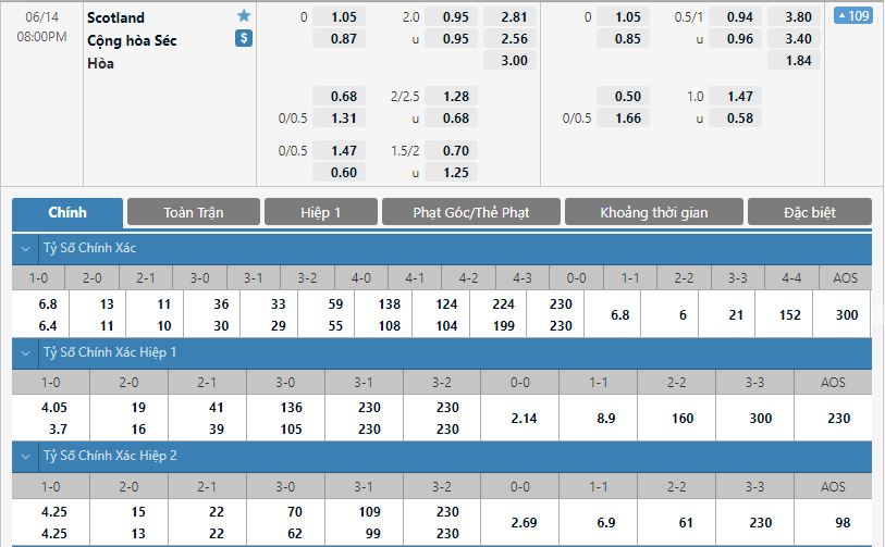 - Kèo tỉ số hiệp 1: Scotland 0-0 CH Séc