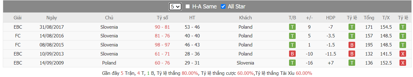 Thành tích đối đầu Slovenia vs Poland