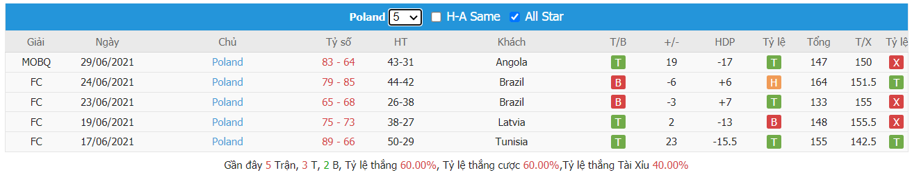 Thống kê cho thấy đây cứ trung bình mỗi trận sau tổng số 10 trận ra sân gần nhất Slovenia cũng đều duy trì được sự phòng khoáng trong lối chơi khi mà trên hàng công đã ghi được trung bình tới 85 điểm mỗi trận và cũng đã để đối thủ bỏ vào rổ nhà trung bình tới 83 điểm mỗi. Từ đó dẫn tới 6 trên 10 trận đấu kể trên đều đã khép lại với các kết quả chung cuộc nổ tài. Vậy nên khả năng bùng nổ tỷ số ở trận tới cũng rất đáng được kỳ vọng khi mà cũng đã tới 7 trên 10 trận ra sân gần nhất của đội khách Poland cũng đều đã vượt qua mức kèo niêm yết theo TLCA. Đồng thời Poland cũng đã ghi được trung bình tới 87 điểm mỗi trận sau tổng số 10 trận ra sân gần nhất.