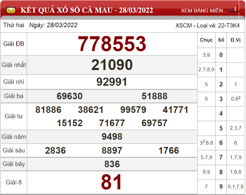 Kết quả lô đề theo xổ số Cà Mau ngày 28/3/2022