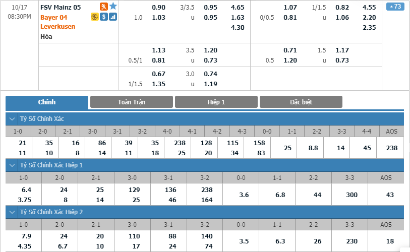 - Kèo tỉ số hiệp 1: FSV Mainz 05 0-2 Bayer Leverkusen