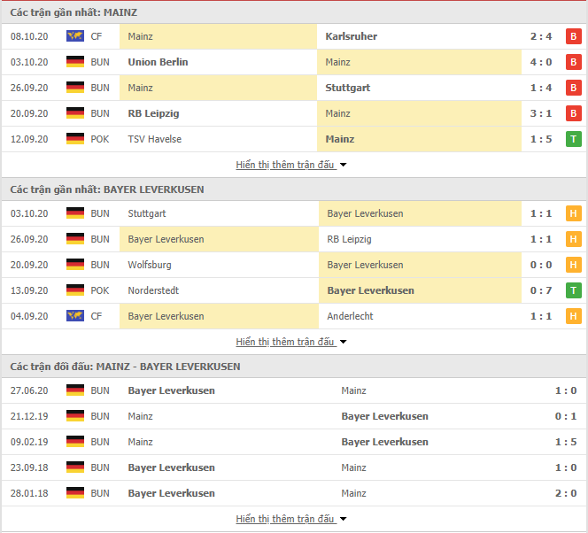 Phong độ gần đây & Thành tích đối đầu FSV Mainz 05 vs Bayer Leverkusen
