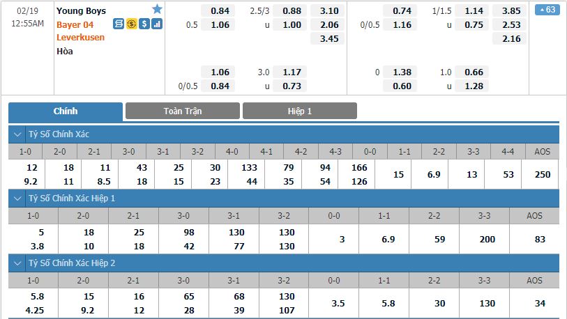 - Kèo tỉ số hiệp 1: Young Boys 0-0 Bayer Leverkusen