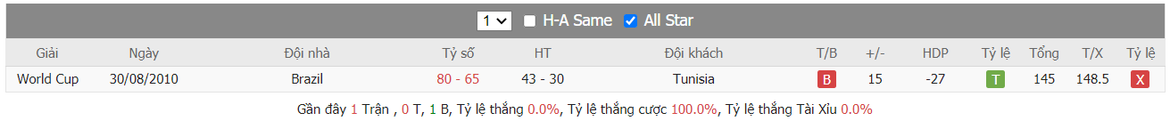 Thành tích đối đầu Tunisia vs Brazil