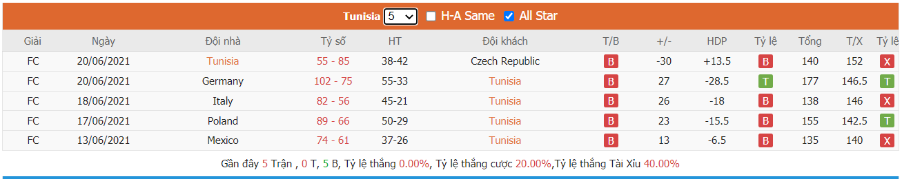 Phong độ gần đây Tunisia vs Brazil